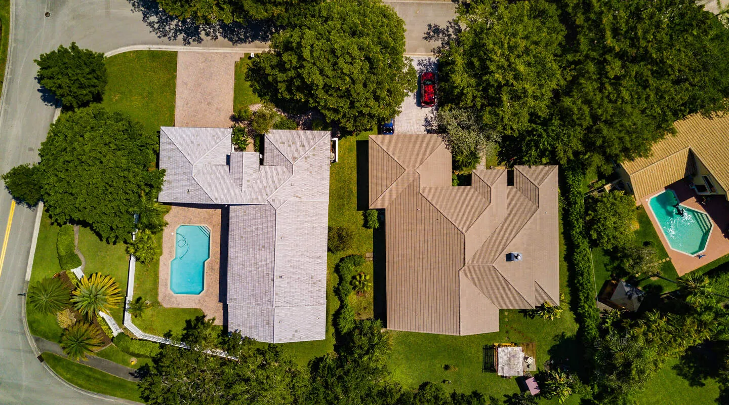 Captures not just the roof, but the relationship between property condition and its environment — from overhanging trees to lot slope.