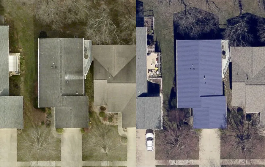 Models trained on thousands of human-labeled events detect full material changes while ignoring lookalikes like patches, solar installs, and additions. A strict QC pipeline drops blurry or outdated images and anchors on consistent visual signals, delivering deeper coverage—including rural areas—and far fewer false positives.