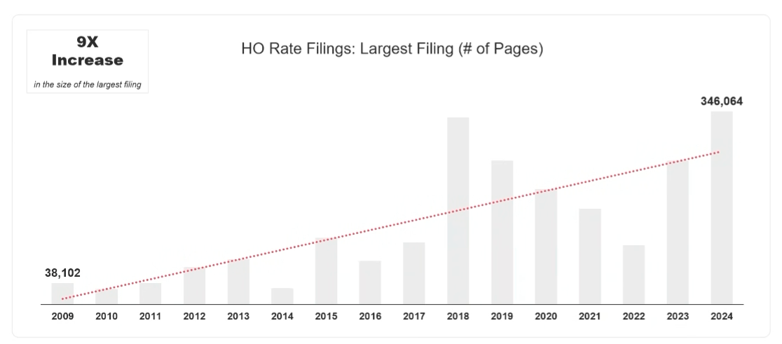 Since then, the volume and complexity of filings have exploded. Our analysis of SERFF filing packages shows that the largest homeowners’ rate filing now exceeds 300,000 pages, including attachments, exhibits, and correspondence. In our data, the biggest package grew from 38,102 pages in 2009 to 346,064 pages in 2024.