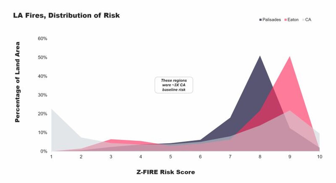 Following the recent Los Angeles wildfires, preliminary analysis indicates that Z-FIRE’s highest-risk ratings closely correspond with the hardest-hit areas, with 94% and 87% of the areas affected by the Palisades and Eaton fires rated as high or very high risk by the model.
